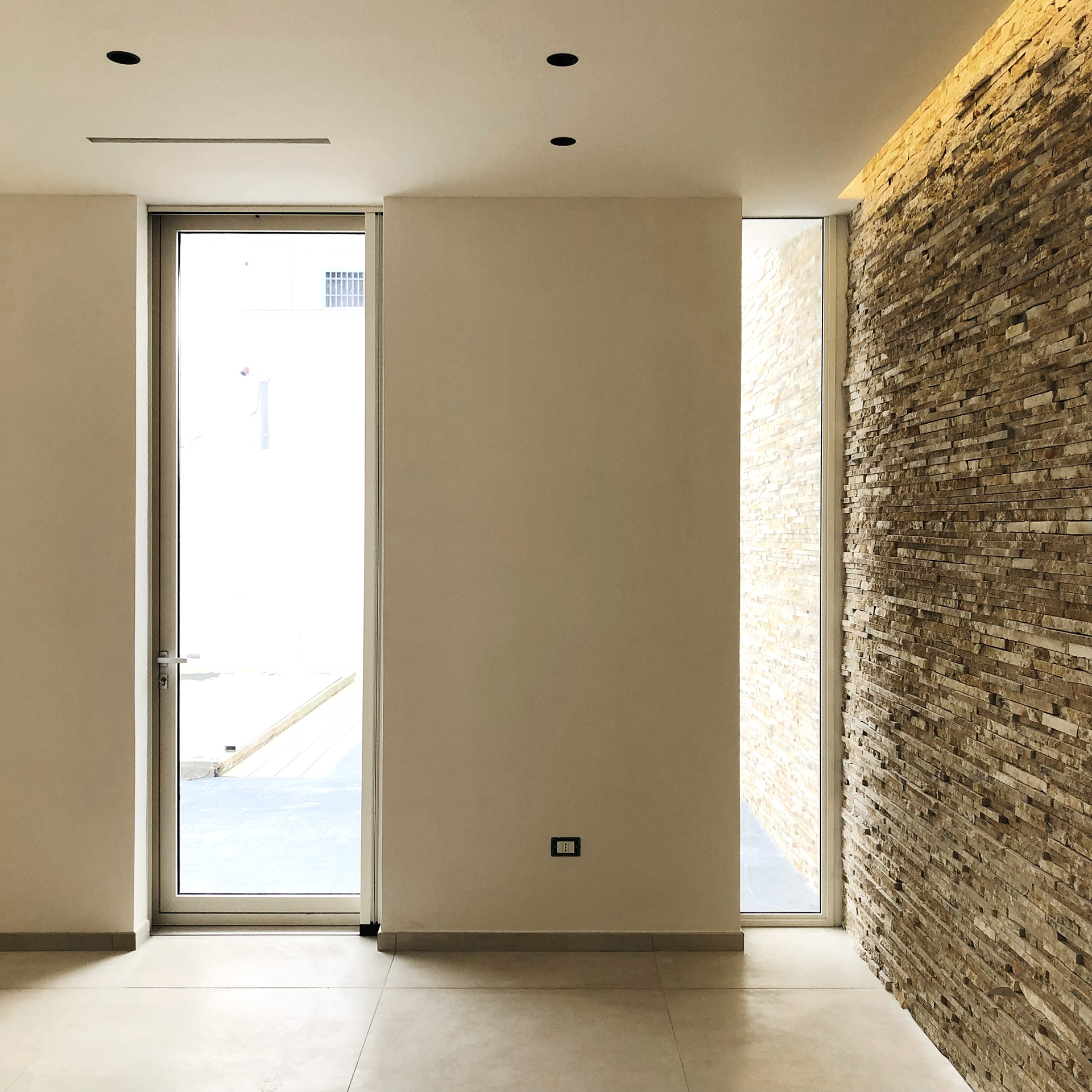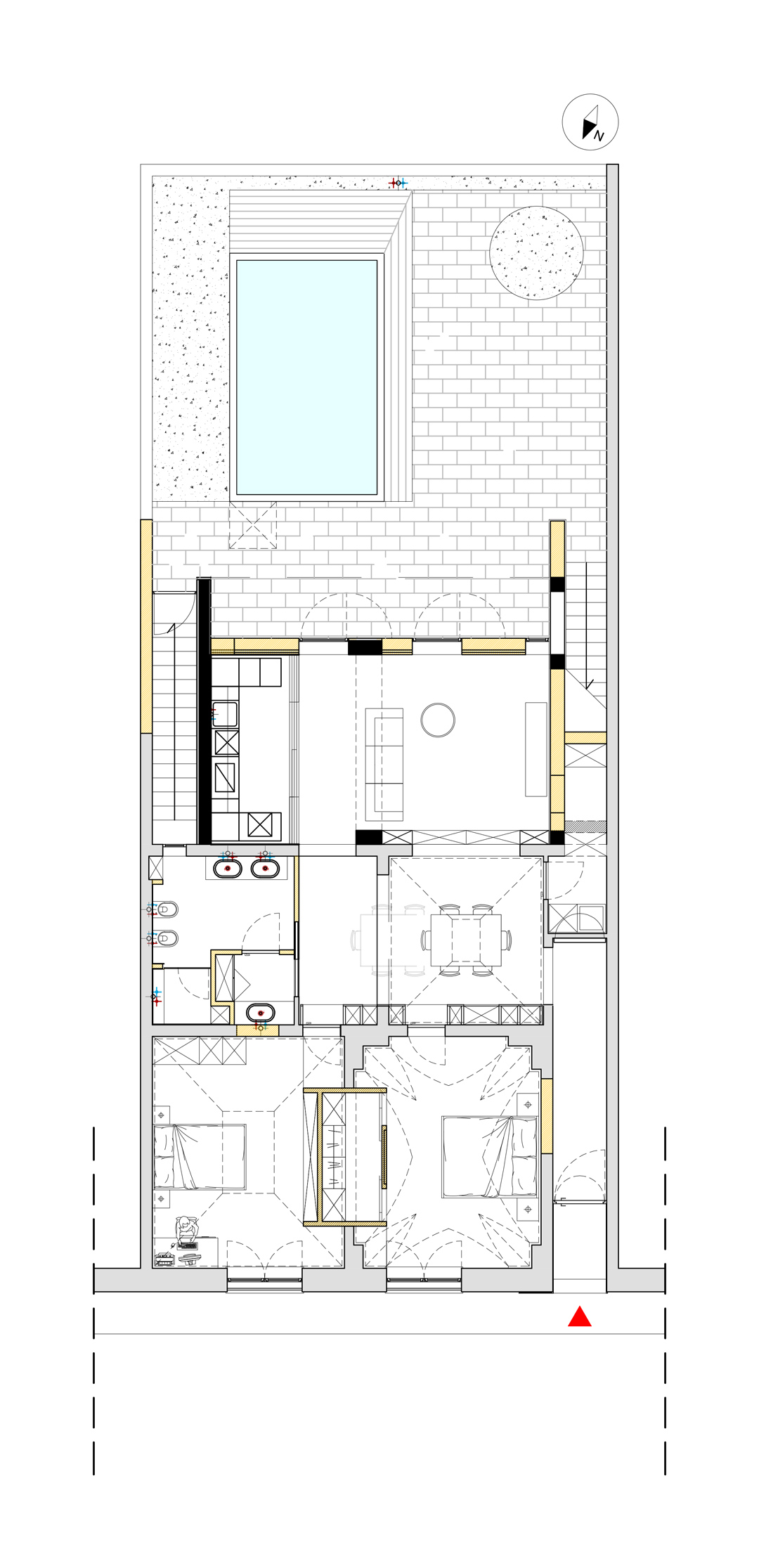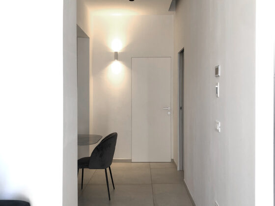 A partire da questo assunto il progetto ha dato risalto alla necessità di spazi ampi e di condivisione. Il perimetro dell’edificio è stato ridefinito (prospetto sud) concedendo la possibilità di ripensare la zona living come ampio open-space. Questa nuova area dell’abitazione ha permesso una completa ri-funzionalizzazione dell’edificio garantendo diverse migliorie, in particolare 1. l’accesso indipendente alle camere da letto 2. un’area bagno più comoda – concepita come una sorta di piccola area benessere 3. una cucina molto più ampia 4. un’area home cinema comoda e suggestiva con affaccio sul giardino 5. una sala da pranzo molto capiente (12 persone) 6. un locale tecnico ricavato nel sottoscala. Il progetto si completa con la ridefinizione delle pavimentazioni esterne, un nuovo accesso al locale cantina e la realizzazione di una piccola piscina scoperta.
